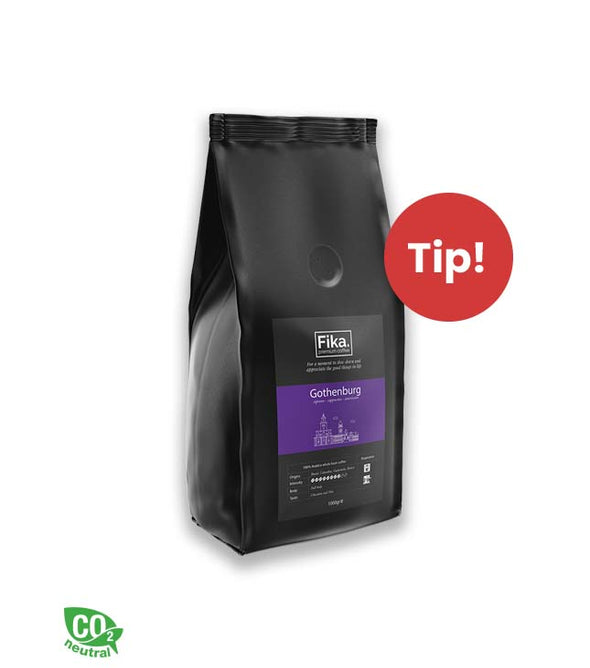 Fika Premium Coffee Koffiebonen | 1 kg"Deze koffie biedt alles wat het hartje begeert van de koffieliefhebber". De Gothenburg koffiebonen heeft een volle body en is een temperamentvolle, aromatische koffie met tonen van noten en graan en perfect voor uw espresso of cappucino. Gothenburg, gelegen aan de westkust van Zweden, heeft het bruisende van de stad, met de natuur voor de deur. Het staat bekend om zijn levendige stedelijkheid, vriendelijke lokale bevolking en geen wonder ... uitstekende ‘Intensivt kaffe’. De bonen zijn verpakt in Co2 neutrale verpakking van 1kg.