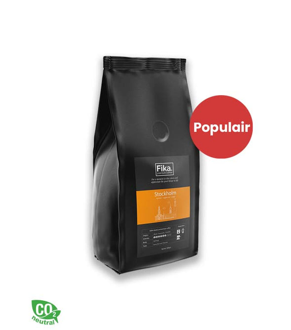 Fika Premium Coffee Koffiebonen | 1 kg"Superieur donker gebrande koffie, zoals een hoofdstad betaamd" De smaak van Stockholm laat zich het best omschrijven als een volle, zoete, aromatische koffie met tonen van fruit en chocolade. Alsof je door de historische straten van Stockholm loopt en de rijke lokale koffiecultuur ervaart. U zult genieten van de superieure smaak van donkere gebrande koffie. Of zoals ze in Zweden zeggen ... Överlägsen Kaffe. De bonen zijn verpakt in een Co2 neutrale verpakking van 1kg.