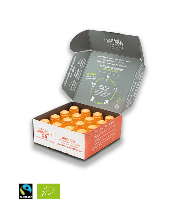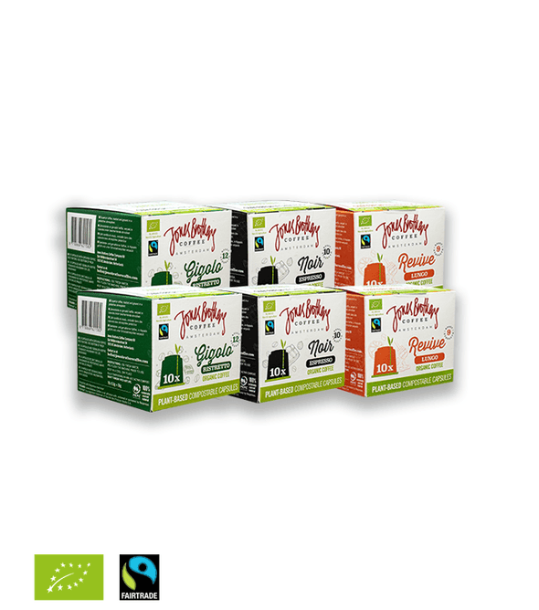 Jones Brothers Koffie capsules | 60cupsDit proefpakket bevat drie van hun beste composteerbare koffies capsules van top kwaliteit; Revive Lungo, Noir Espresso en Gigolo Ristretto. Jones Brothers Coffee werkt sinds 2013 aan koffiegeluk. Van de boon tot het kopje, gaan zij voor een glimlach. Ze nodigen je graag uit in hun koffiewereld! De koffie is zowel Biologisch als Fair Trade gecertificeerd.