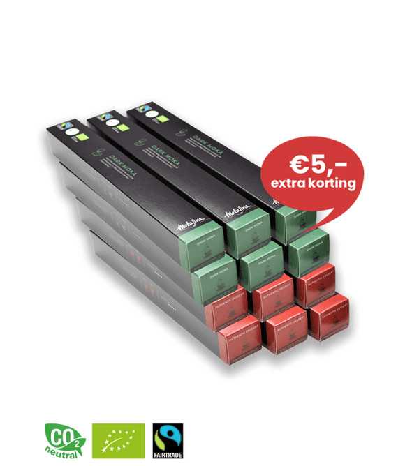 Mokafina Koffie capsules | 120cups"Het geheim van België" Ervaar ook deze opvallend lekkere vers gebrande koffies met een authentiek karakter. Voor uw perfecte Ristretto, Espresso of Lungo. 60 Nespresso® compatible aluminium capsules per smaak; Dark Moka en Authentic Dessert. Dus 120 capsules in totaal! Wat een deal! Beide koffies zijn zowel 100% biologisch als Fair Trade gecertificeerd. Dan smaak de koffie toch net even lekkerder!