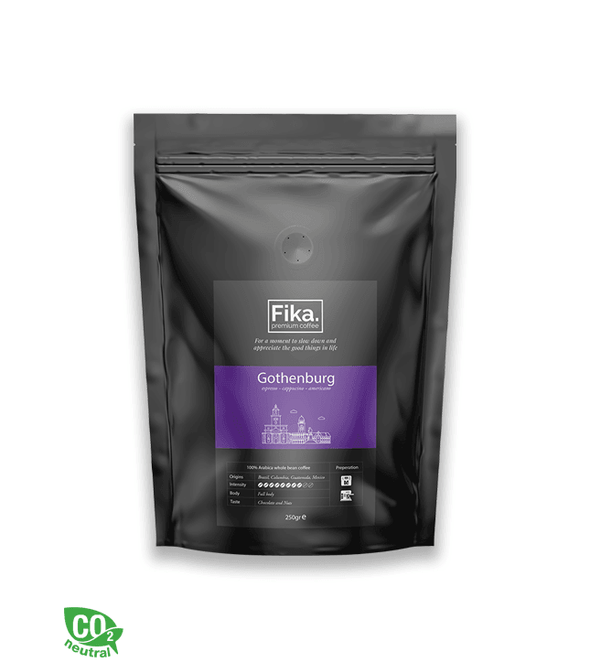 Fika Premium Coffee Koffiebonen | 250gr"Deze koffie biedt alles wat het hartje begeert van de koffieliefhebber". De Gothenburg koffiebonen heeft een volle body en is een temperamentvolle, aromatische koffie met tonen van noten en graan en perfect voor uw espresso of cappucino. Gothenburg, gelegen aan de westkust van Zweden, heeft het bruisende van de stad, met de natuur voor de deur. Het staat bekend om zijn levendige stedelijkheid, vriendelijke lokale bevolking en geen wonder ... uitstekende ‘Intensivt kaffe’. Deze bonen zijn verpakt in een 250grams hersluitbare verpakking.