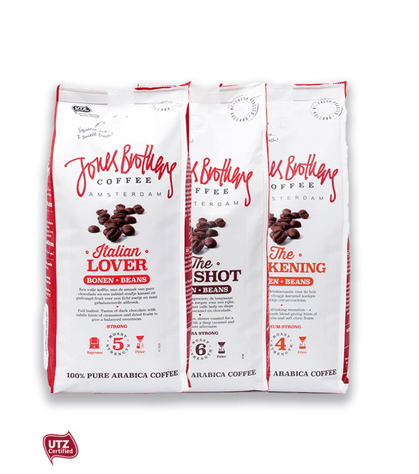 Jones Brothers Koffiebonen | 1,5kgDit koffiebonen proefpakket bevat 3 van hun top koffies; Italian Lover, The Awakening en Big Shot. Jones Brothers Coffee is al jaren een begrip is in de wereld van koffie! Van de boon tot het kopje, gaan ze voor een glimlach. Ze nodigen je graag uit in hun koffiewereld! De koffiebonen zijn UTZ gecertificeerd.